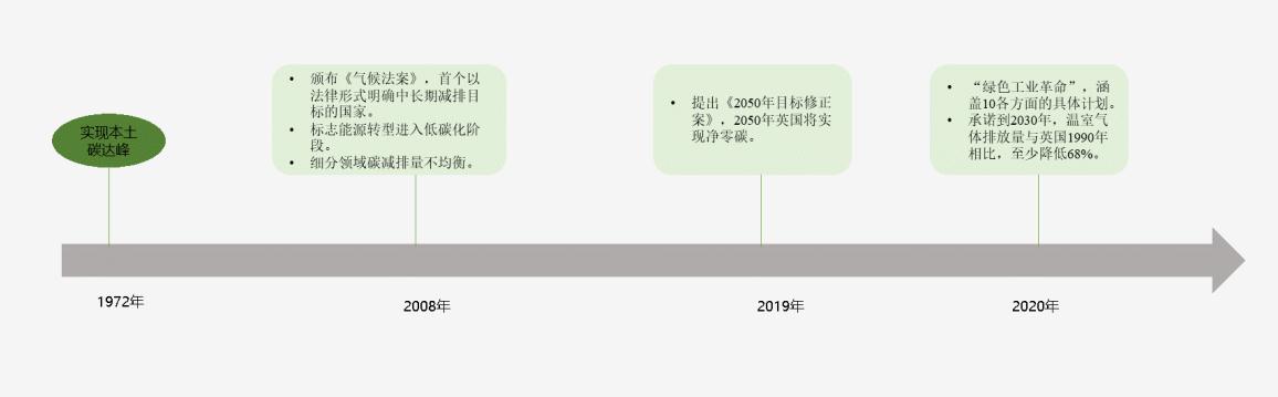報(bào)告圍繞中國(guó)應(yīng)對(duì)氣候變化的政策措施、歐美日主要國(guó)家的典型做法、中國(guó)“碳達(dá)峰、碳中和”現(xiàn)狀及實(shí)施路徑等方面進(jìn)行深度分析,重點(diǎn)在電力行業(yè)、工業(yè)行業(yè)、交通運(yùn)輸行業(yè)、建筑行業(yè)展開(kāi)專(zhuān)題研究,共同探討各地方政府實(shí)現(xiàn)“雙碳”目標(biāo)的行動(dòng)方案,以期為地方政府決策及業(yè)界參考提供智力支撐,助力我國(guó)“碳達(dá)峰、碳中和”目標(biāo)的實(shí)現(xiàn)。 1.碳達(dá)峰發(fā)展階段 在應(yīng)對(duì)全球氣候變化、實(shí)現(xiàn)碳中和目標(biāo)上,英國(guó)通過(guò)一系列的承諾和改革舉措,在該領(lǐng)域保持世界領(lǐng)先地位。 英國(guó)早在1972年就已經(jīng)實(shí)現(xiàn)本土碳達(dá)峰,2008年正式頒布《氣候變化法》,確定了到2050年將溫室氣體排放量比1990年減少80%的長(zhǎng)期減排目標(biāo),成為世界上首個(gè)以法律形式明確中長(zhǎng)期減排目標(biāo)的國(guó)家。在法案通過(guò)后的10年間,英國(guó)溫室氣體減排初具成效,2018年比2008年下降了30%。 2019年6月,英國(guó)提出了《2050年目標(biāo)修正案》,正式確立到2050年實(shí)現(xiàn)溫室氣體“凈零排放”。 2020年11月宣布一項(xiàng)涵蓋10個(gè)方面的“綠色工業(yè)革命”計(jì)劃,包括大力發(fā)展海上風(fēng)能、推進(jìn)新一代核能研發(fā)和加速推廣電動(dòng)車(chē)等。 2020年12月宣布最新減排目標(biāo),承諾到2030年英國(guó)溫室氣體排放量與1990年相比,至少降低68%。