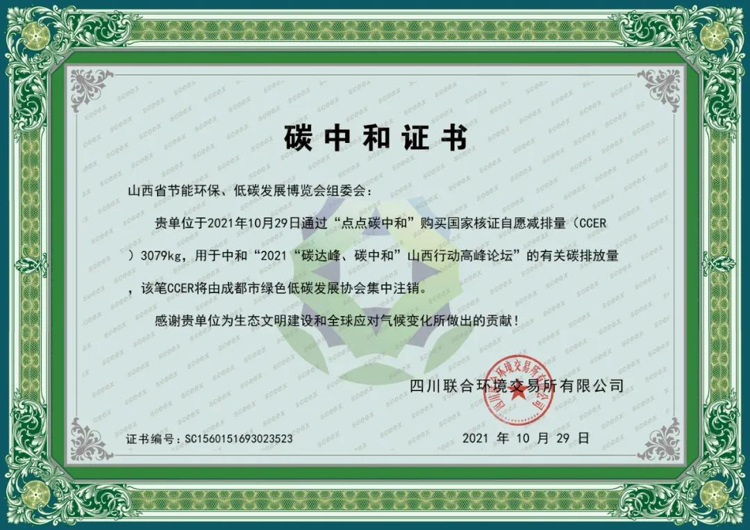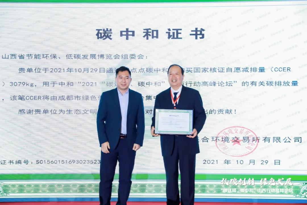 祥睿能源作為會(huì)議協(xié)辦單位,結(jié)合會(huì)議“低碳創(chuàng)新·綠色發(fā)展”的主題,聯(lián)合主辦方打造成了名副其實(shí)的山西首次碳中和博覽會(huì),即將本次會(huì)議執(zhí)行過(guò)程中產(chǎn)生的二氧化碳排放量,通過(guò)購(gòu)買 CCER實(shí)現(xiàn)了碳減排的抵消。同時(shí),在現(xiàn)場(chǎng)授予了大會(huì)組委會(huì)《碳中和證書(shū)》,由省節(jié)能協(xié)會(huì)會(huì)長(zhǎng)藺建國(guó)代表組委會(huì)領(lǐng)取了該項(xiàng)證書(shū)。