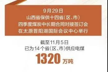 山西作為全國(guó)的產(chǎn)煤主要省份,積極貫徹落實(shí)黨中央、國(guó)務(wù)院關(guān)于做好煤炭保供穩(wěn)價(jià)工作、確保群眾溫暖過(guò)冬的決策部署,發(fā)揮能源大省的使命擔(dān)當(dāng),站在講貢獻(xiàn)、講大局、講落實(shí)的高度,在基本滿足本省民生用煤需求的基礎(chǔ)上,按照“雙控”要求限制高耗能企業(yè)用煤,把有限的能源不遺余力地貢獻(xiàn)出來(lái),全力以赴為用煤緊張的省份提供適銷對(duì)路的優(yōu)質(zhì)煤炭,推動(dòng)煤炭?jī)r(jià)格理性回歸,為保障國(guó)家能源安全和群眾溫暖過(guò)冬作出了積極貢獻(xiàn)。 推動(dòng)煤炭增產(chǎn)增供 9月29日,“山西省保供十四?。▍^(qū)、市)四季度煤炭中長(zhǎng)期合同對(duì)接簽訂會(huì)”在太原晉陽(yáng)湖國(guó)際會(huì)議中心舉行。會(huì)上,山西與河北、山東、江蘇、浙江、天津等14個(gè)省(區(qū)、市)簽訂四季度煤炭中長(zhǎng)期保供合同,保障能源供應(yīng)。截至11月5日,已為14個(gè)?。▍^(qū)、市)供應(yīng)電煤1320萬(wàn)噸。