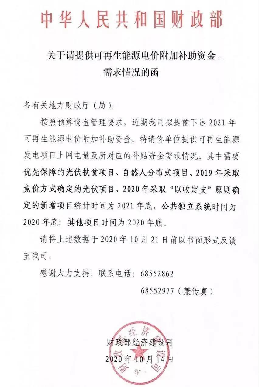 財政部下發(fā)了《關(guān)于請?zhí)峁┛稍偕茉措妰r附加補助資金需求情況的函》,擬提前下發(fā)2021年可再生能源電價附加補助資金。 通知明確表示,將優(yōu)先保障光伏扶貧項目、自然人分布式項目、2019年競價光伏項目、2020年“以收定支”新增項目。補貼時間截止為2021年底,公共獨立系統(tǒng)和其他項目的補貼截止時間為2020年底。 統(tǒng)計申報截止時間為2020年10月21日。